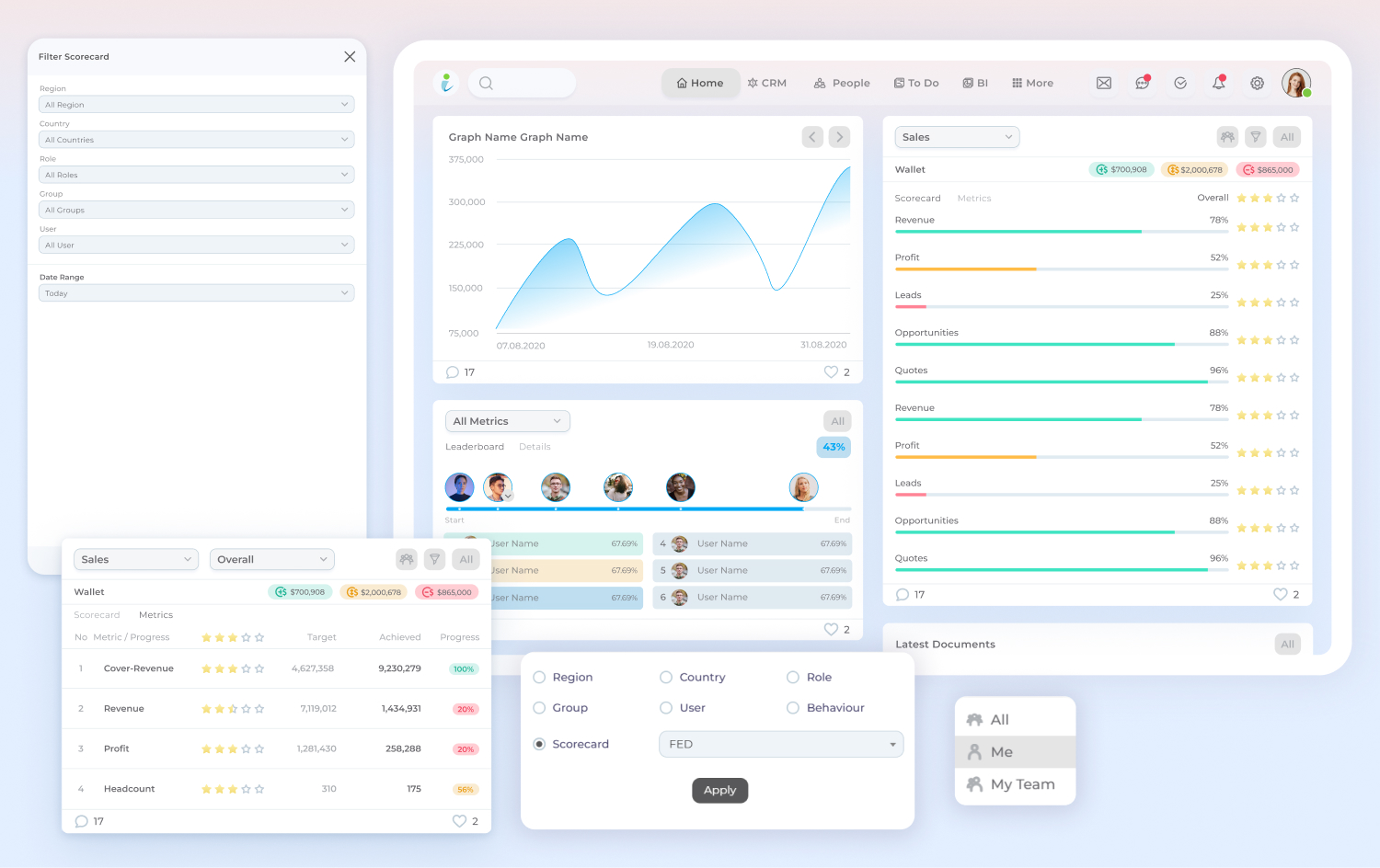 Combine the set targets and metrics into visual gauges to give instant performance feedback and prioritization. You are in total control of your performance management, setting the number of metrics, and keeping everyone aligned